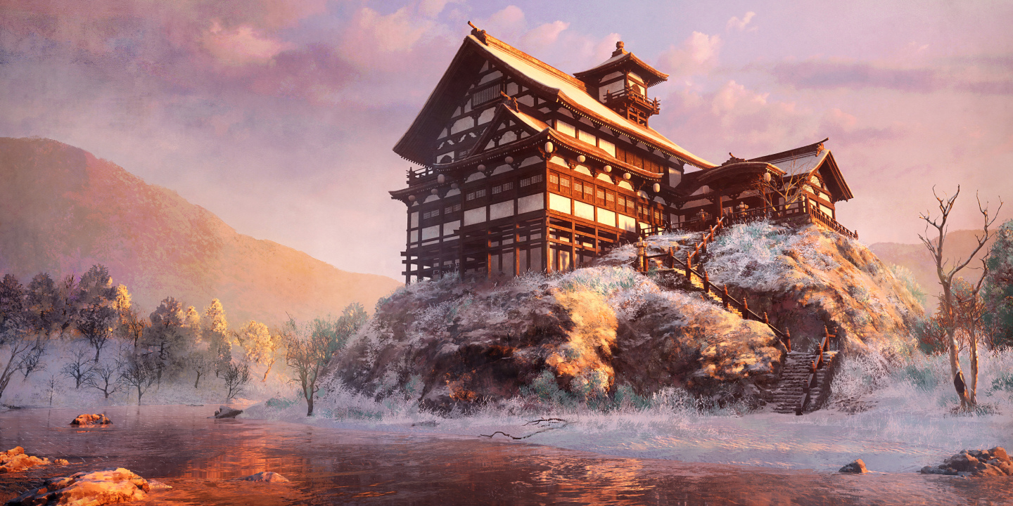 AI艺术、数字绘画、建筑、日落、森林、雪景、河流