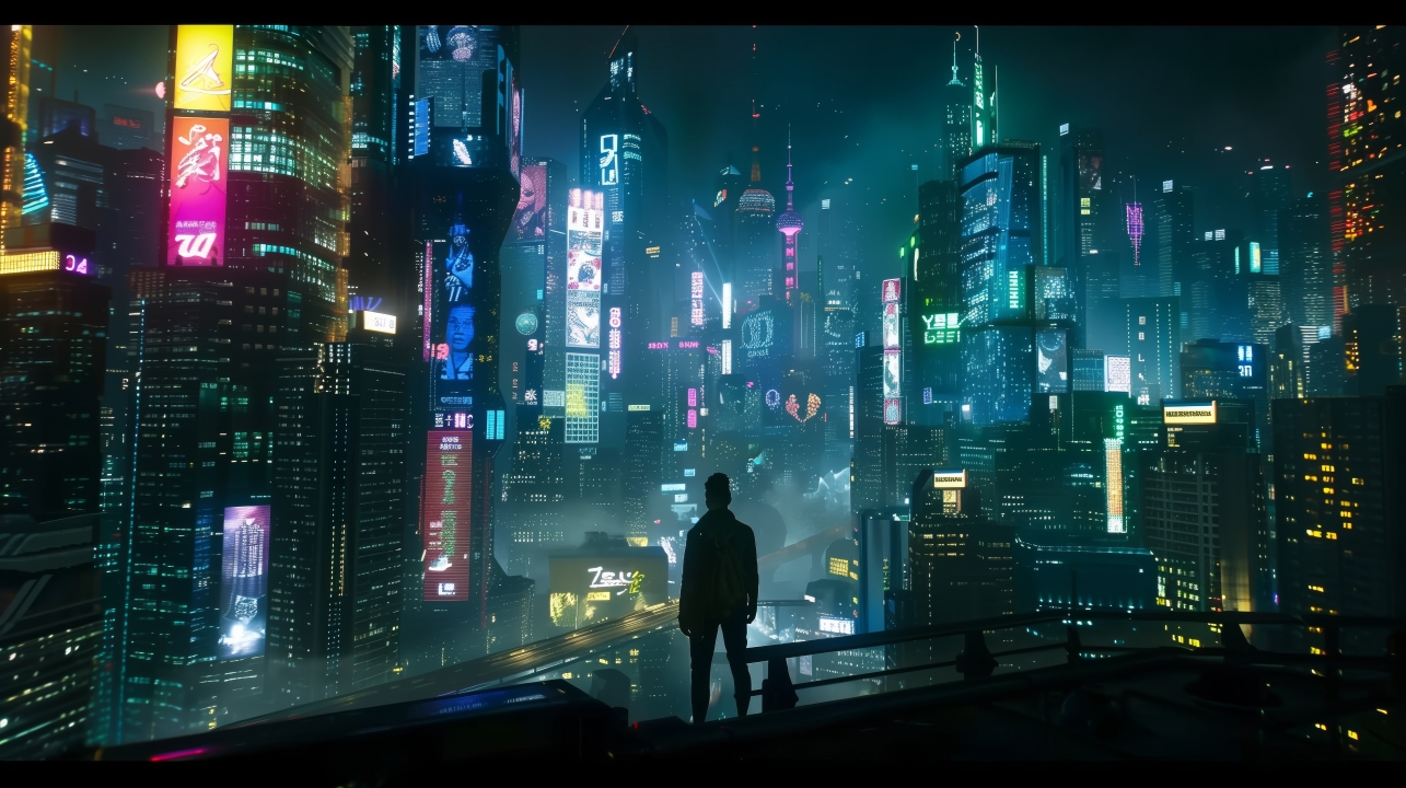 AI艺术、赛伯朋克、城市景观、霓虹灯、剪影