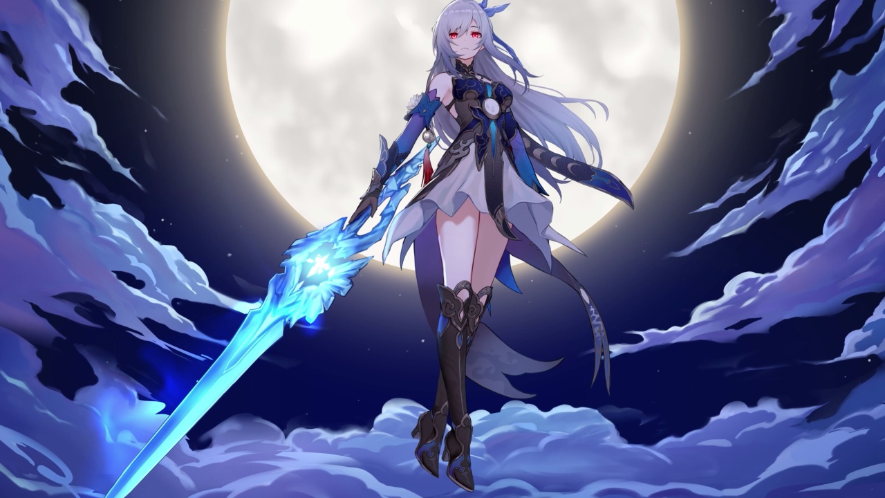 金发、侧、抱膝、红眼睛、赤脚、雨牙、天空、夜晚、地平线、白色、连衣裙、动漫、女孩