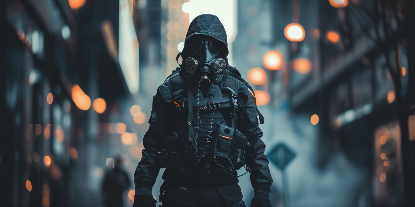 AI艺术、赛伯朋克、城市、街道、防毒面具、烟、兜帽