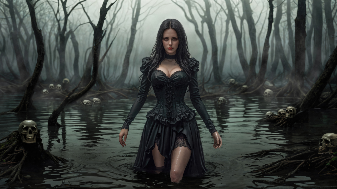 景深、紧身衣、连衣裙、雾、深色、水