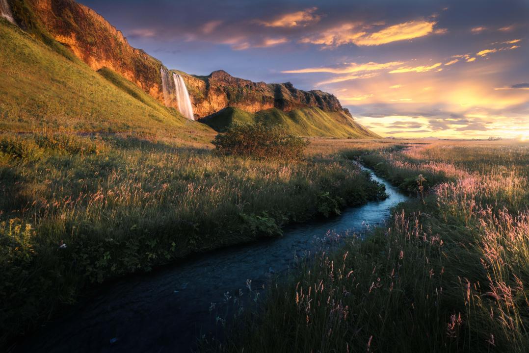 河流、自然、瀑布、风景、云、日落、田野、悬崖