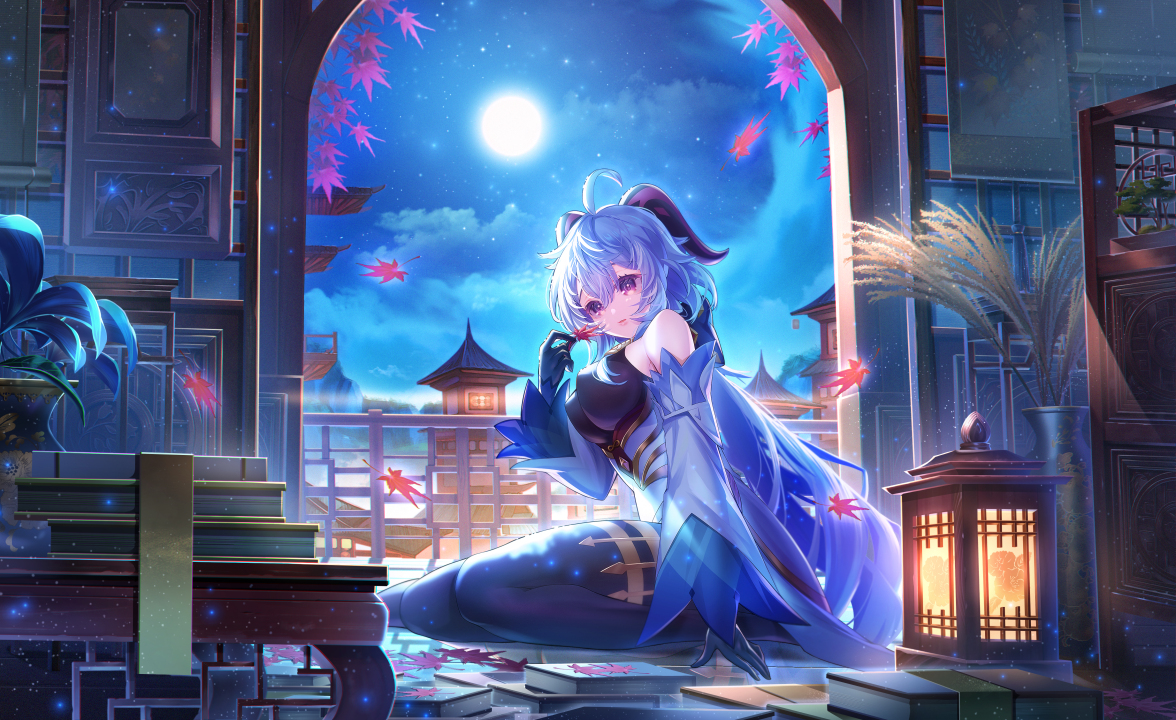 原神、动漫、女孩、树叶、夜、月、书