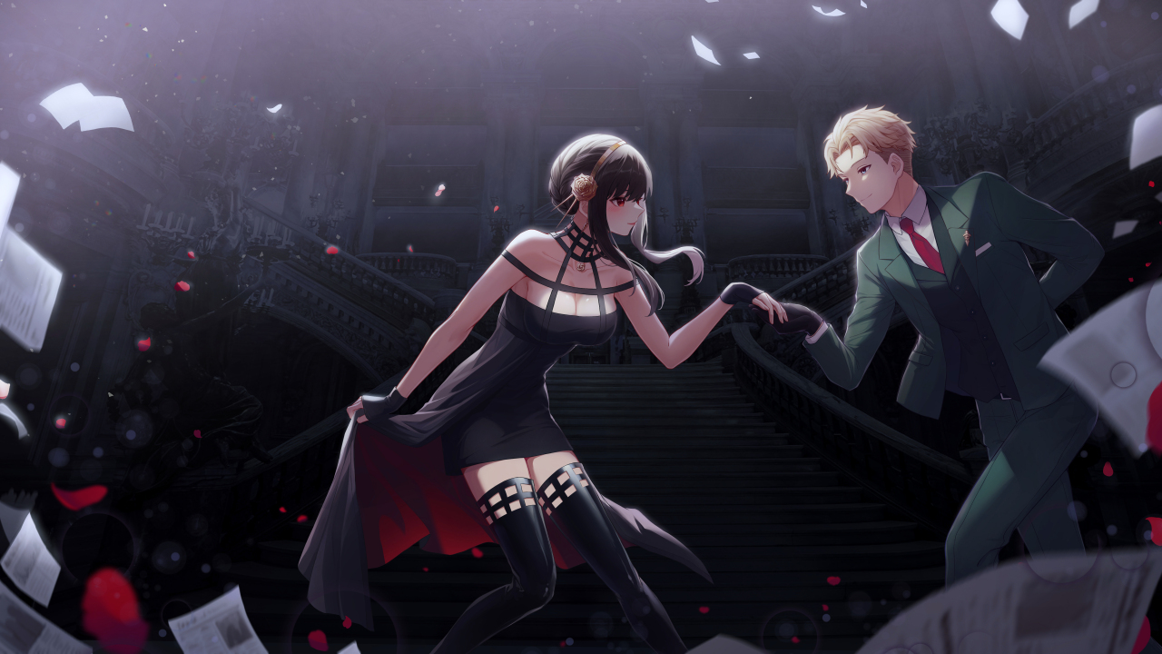 女人、黑发、红眼睛、动漫、女孩、间谍家族、城堡、黑色连衣裙、手套、领带、豪宅、AI艺术、男人、跳舞、男孩、间谍过家家