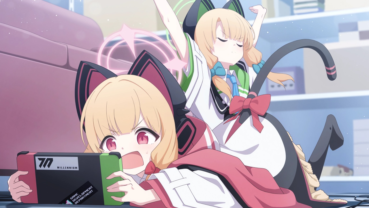 蔚蓝档案、黑发、高烧、碧蓝航线、动漫、女孩、黑色长袜、连裤袜、银发、棕色眼睛、兽耳、制服、樱花