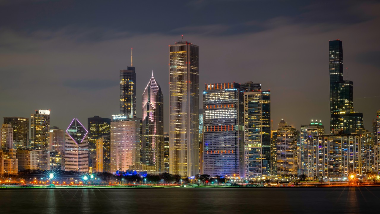 景观、城市、建筑、树木、灯光、夜、摩天大楼、公寓、天际线、天空、水、河流