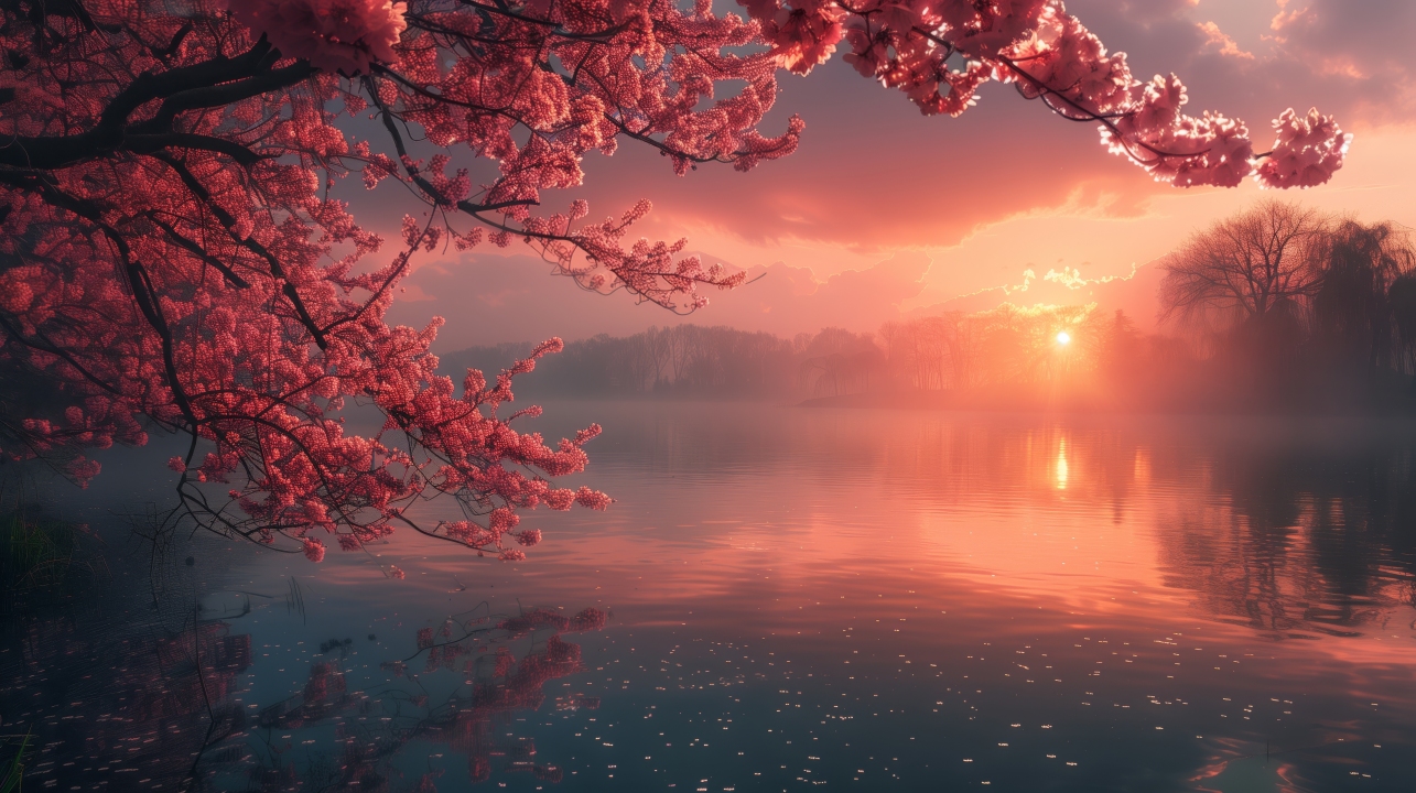AI艺术、插画、云、樱桃树、湖泊、日落