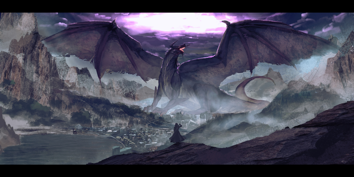 战士、AI艺术、插图、生物、龙、翅膀、剑、世界末日、毁灭、山脉、奇幻艺术