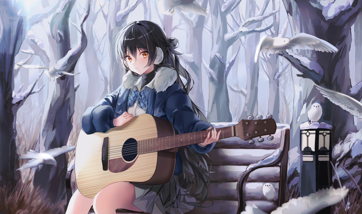 原创、人物、黑发、动漫、动漫女孩、鸟、雪、棕色眼睛、艺术