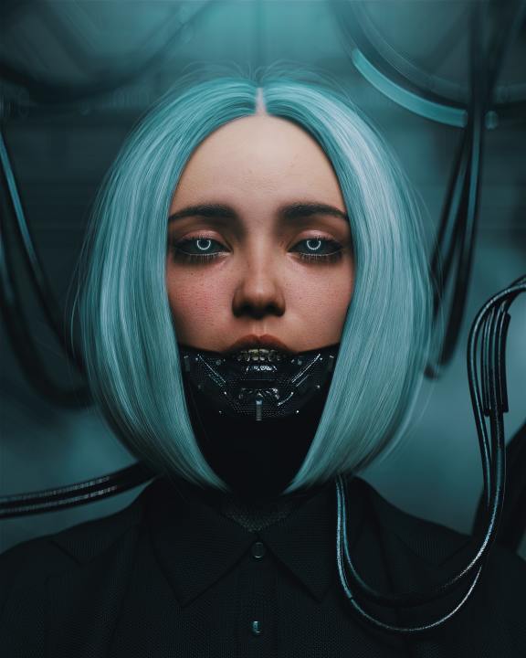 女人、蓝头发、AI艺术、插图、肖像、面具、赛博朋克