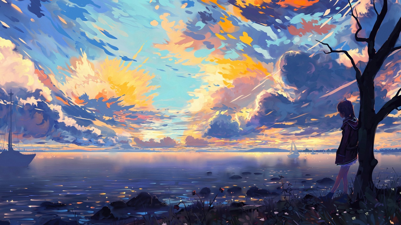 动漫、动漫女孩、天空、水