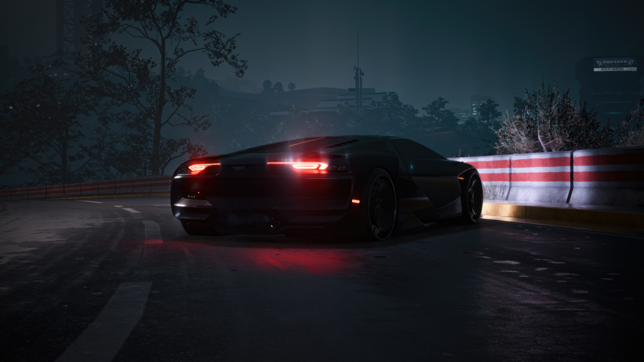 赛博朋克、汽车、尾灯、道路、树木、车轮、未来派、卫星、天线、风景、低光、数字、艺术、视频、游戏