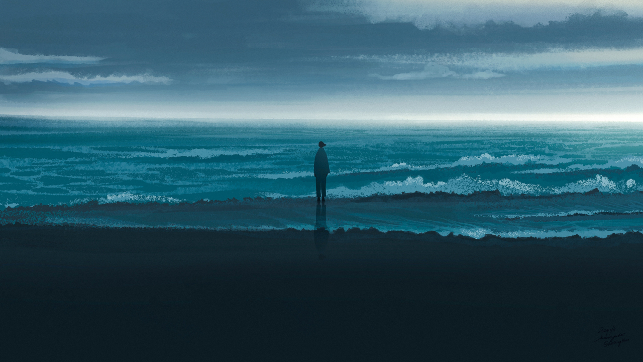 站立、头发、艺术品、数字艺术、数字绘画、动漫、海滩、阴影、波浪、云、孤独