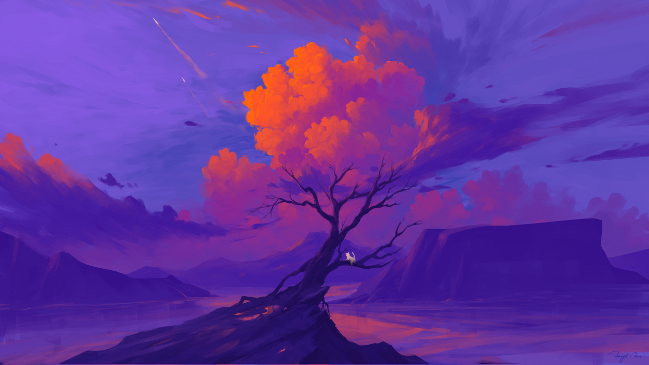 数字艺术、艺术品、插图、风景、自然、树、山、湖、云、签名、猫