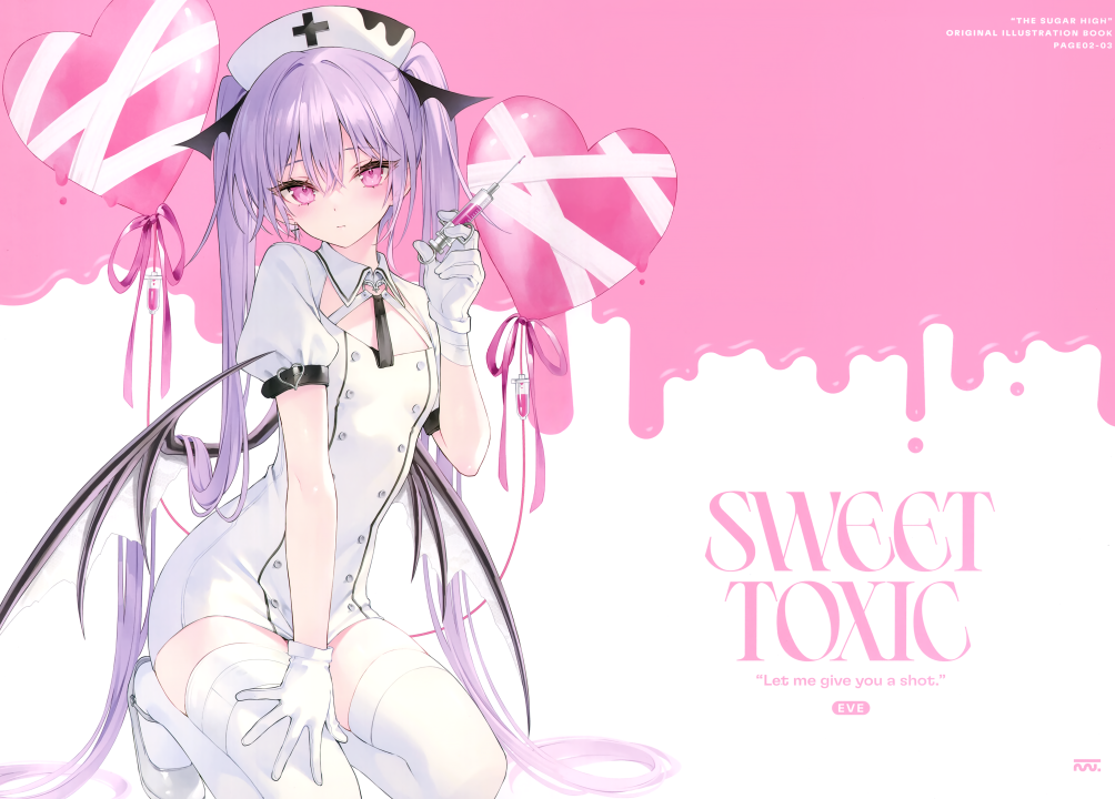 护士、长发、动漫、动漫女孩、针、双尾、简单背景、长袜、手套、翅膀、心脏、耳环、十字架