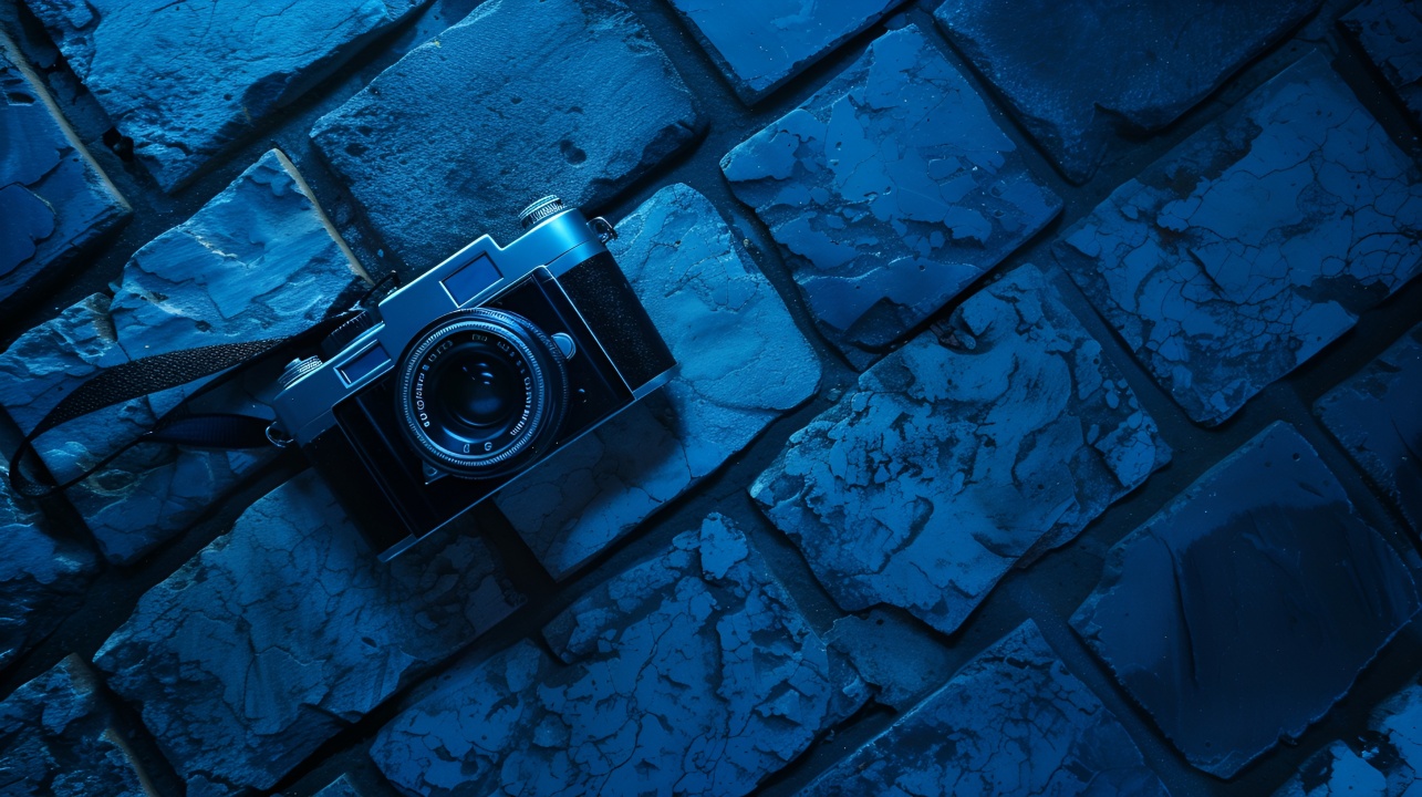 蓝色砖墙上的经典相机:时光的记忆”