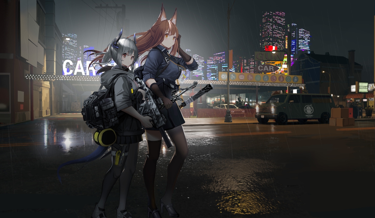 枪、户外、汽车、包、动漫、女孩、战士利斯卡姆、弗兰卡、剑、武器、号角、尾巴、兽耳、夜晚