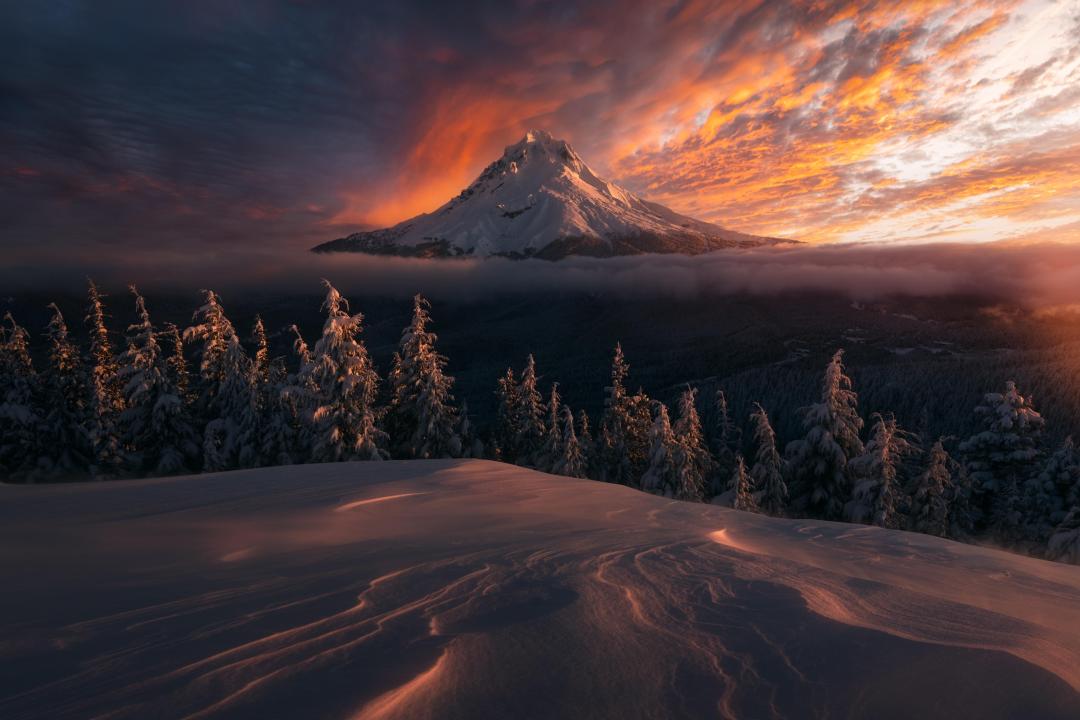云、自然、风景、日落、俄勒冈州、冬天、雪、山脉、夕阳辉光