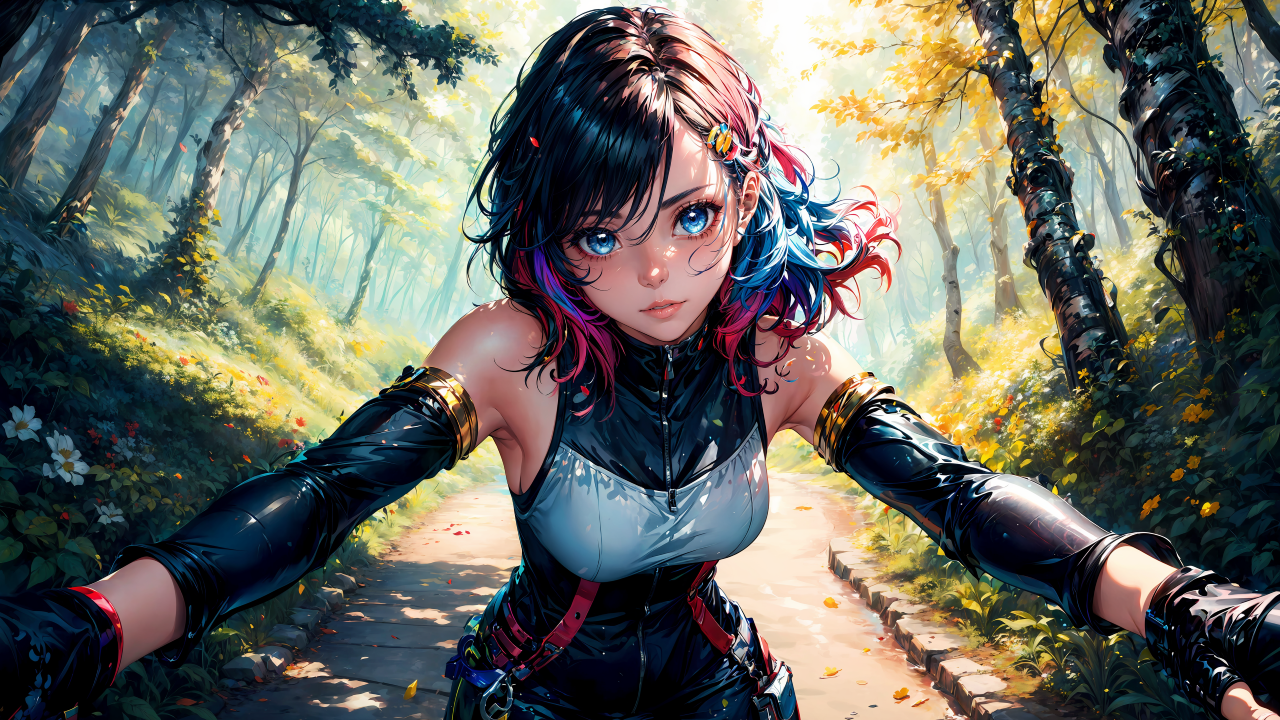 头发、蓝眼睛、女人、艺术、动漫、自然、小路、手套、树叶、树木、森林、AI艺术、动漫女孩、鲜花