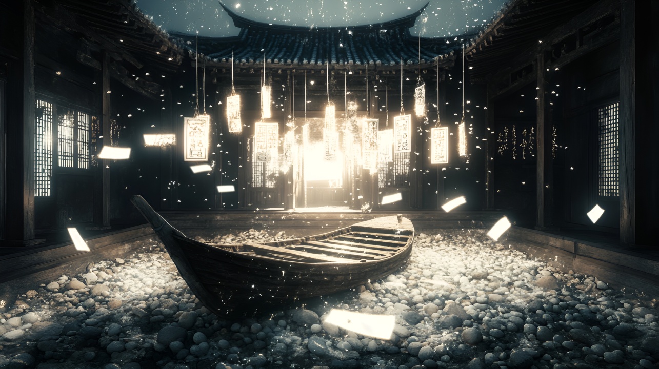 漂浮的梦境:神秘古船与星空下的石子庭院”