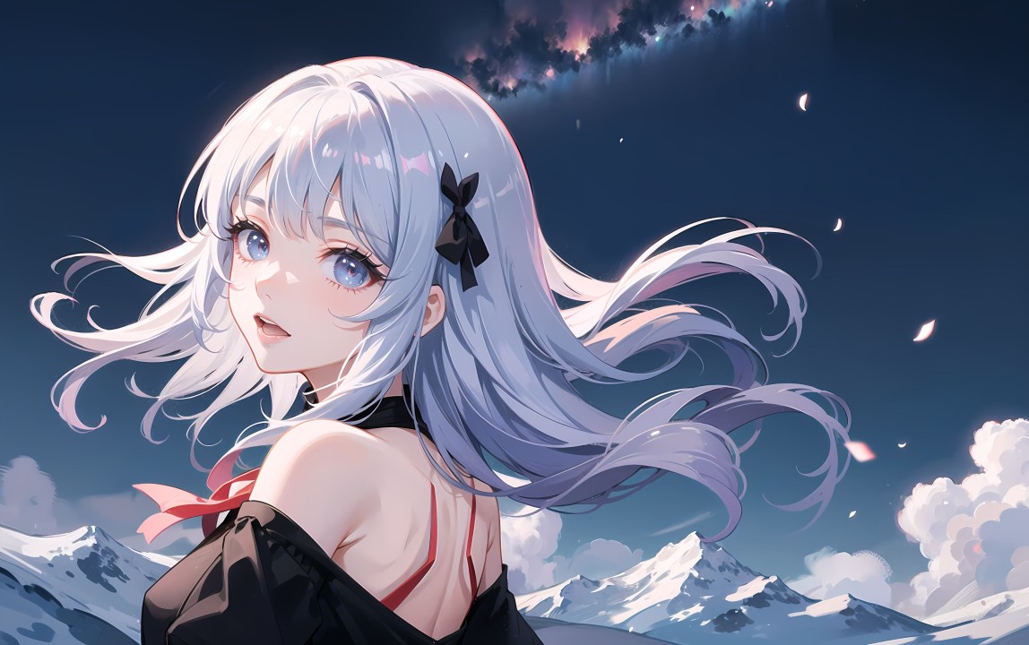 艺术、银发、动漫女孩、云、雪、山、花瓣