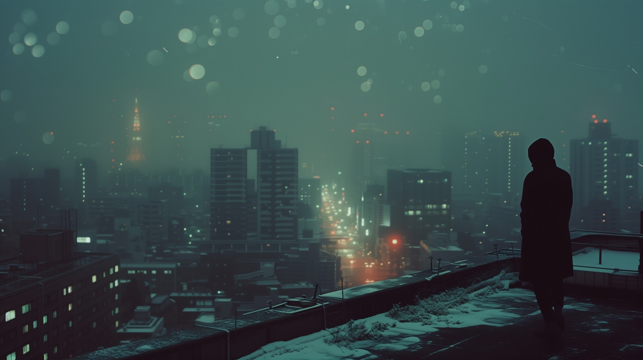 AI艺术、插画、夜晚、视点、城市景观、天际线、屋顶、薄雾