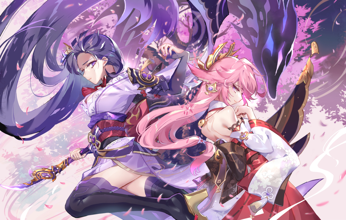 原神、长发、微笑、动漫、女孩、花瓣、武器
