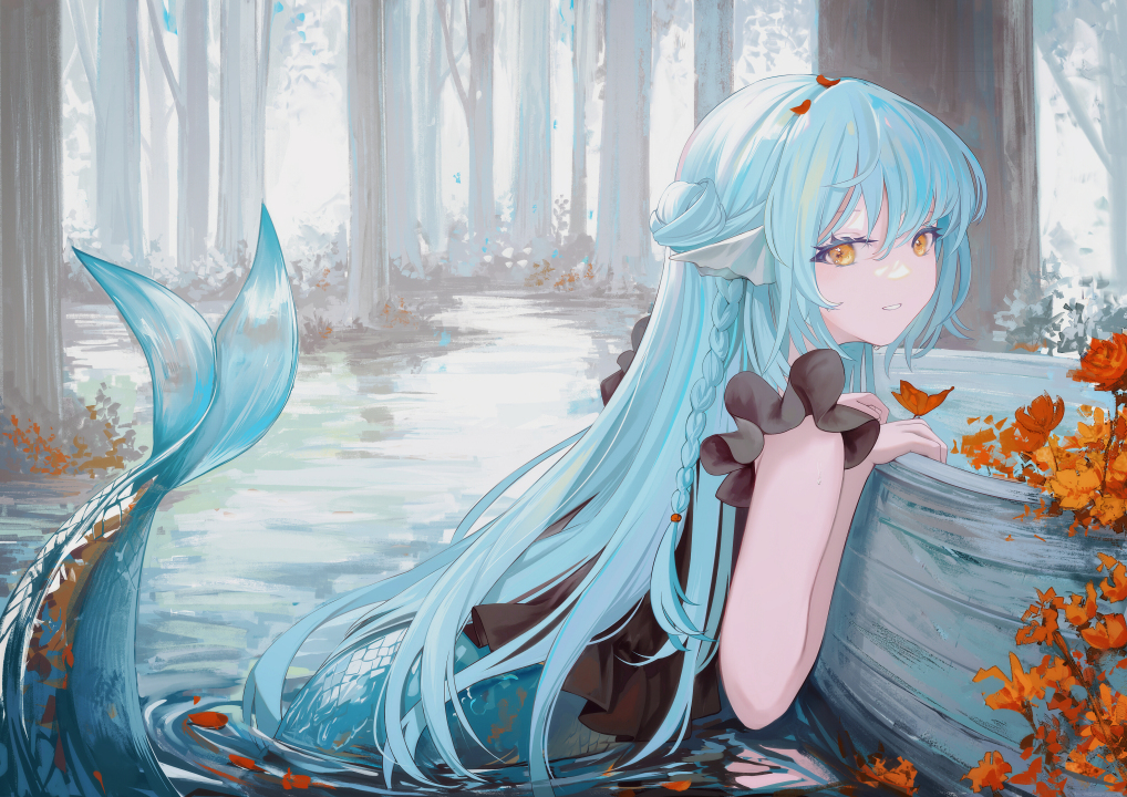 长发、蓝头发、辫子、动漫、动漫女孩、水、树、蝴蝶、黄眼睛、美人鱼