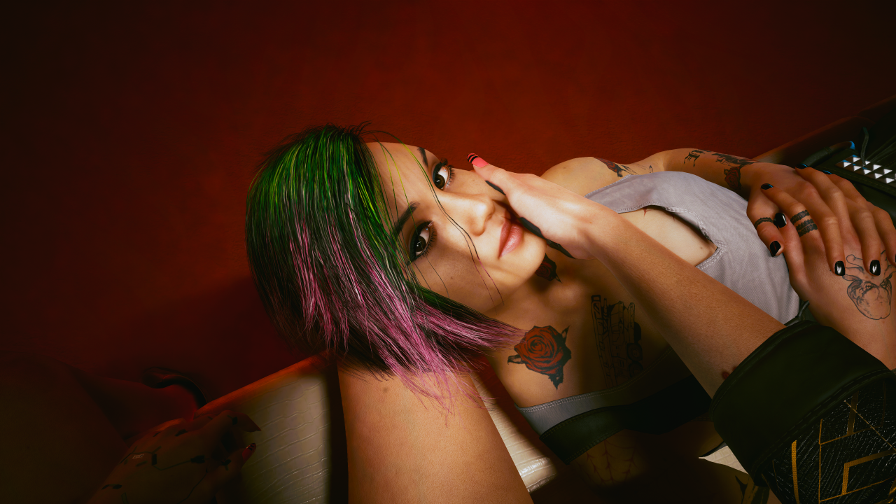 短发、电子游戏、多色头发、手、躺下、仰卧、摸脸、彩绘、指甲、赛博朋克、纹身、玫瑰、黑指甲