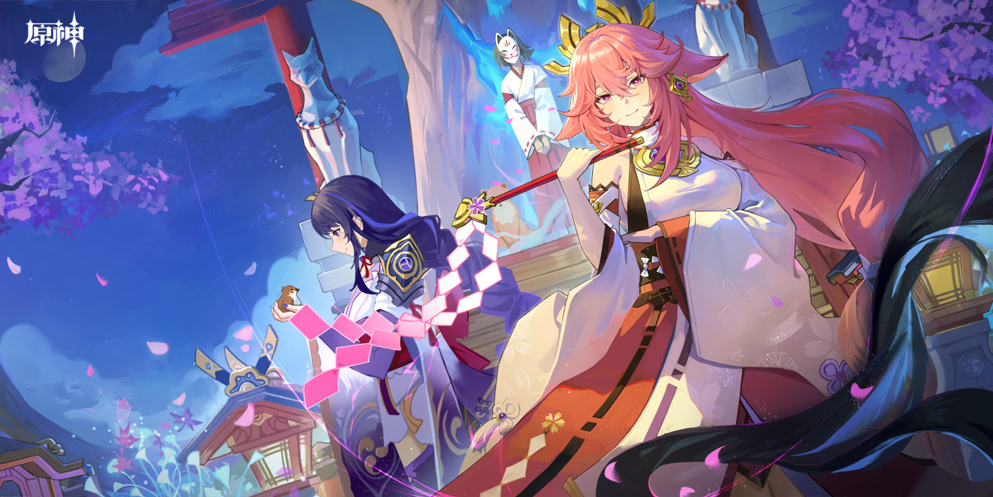 原神、长发、微笑、站着、动漫、动漫女孩、花瓣、鸟井、面具