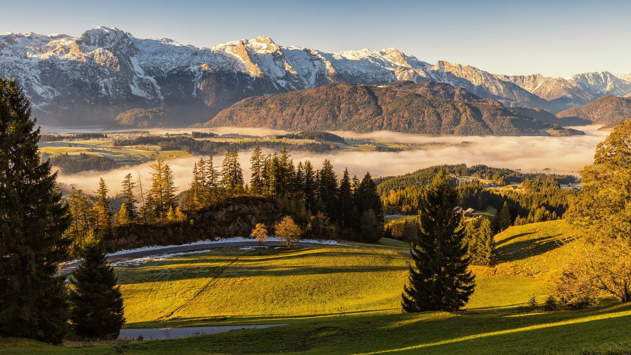 自然、风景、奥地利、田野、山脉、薄雾、森林、天空