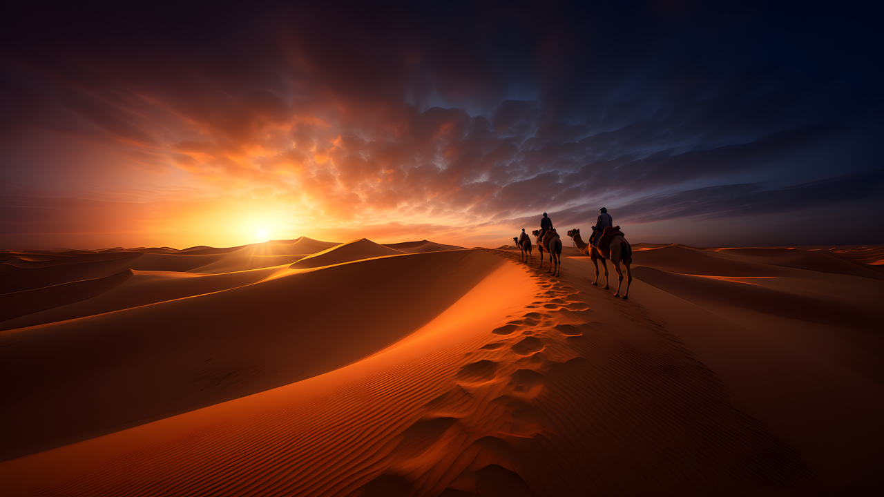 沙漠、艺术、沙、日落、晚霞、天空、云、AI艺术、动物