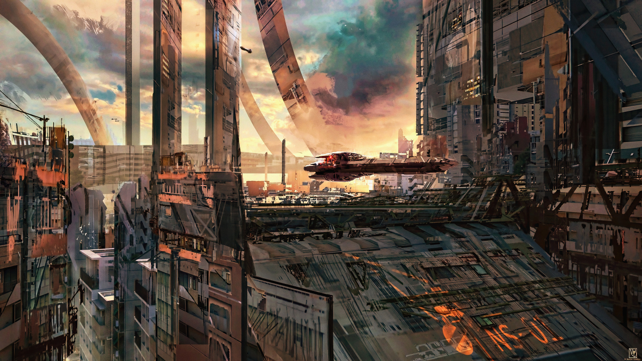 科幻、AI艺术、概念艺术、未来、奇幻艺术、日落、飞船、赛博朋克、网络