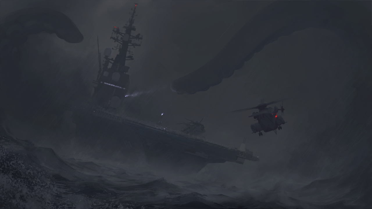 AI艺术、海、船舶、浪、海怪、触手、黑暗、直升机、风暴、航空、母舰、奇幻艺术