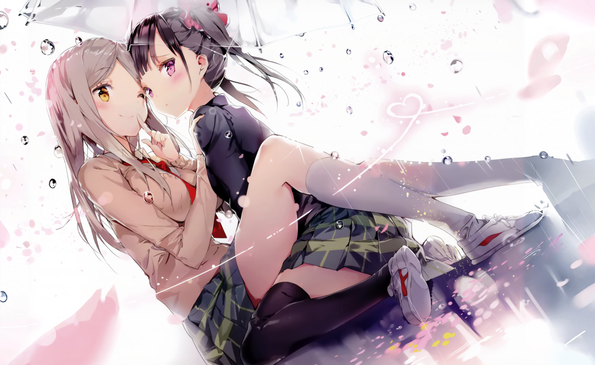 女学生、微笑、动漫、女孩、校服、雨伞、水滴、腮红、长袜、袜子、鞋子、水、心、樱花、小把戏、尤里