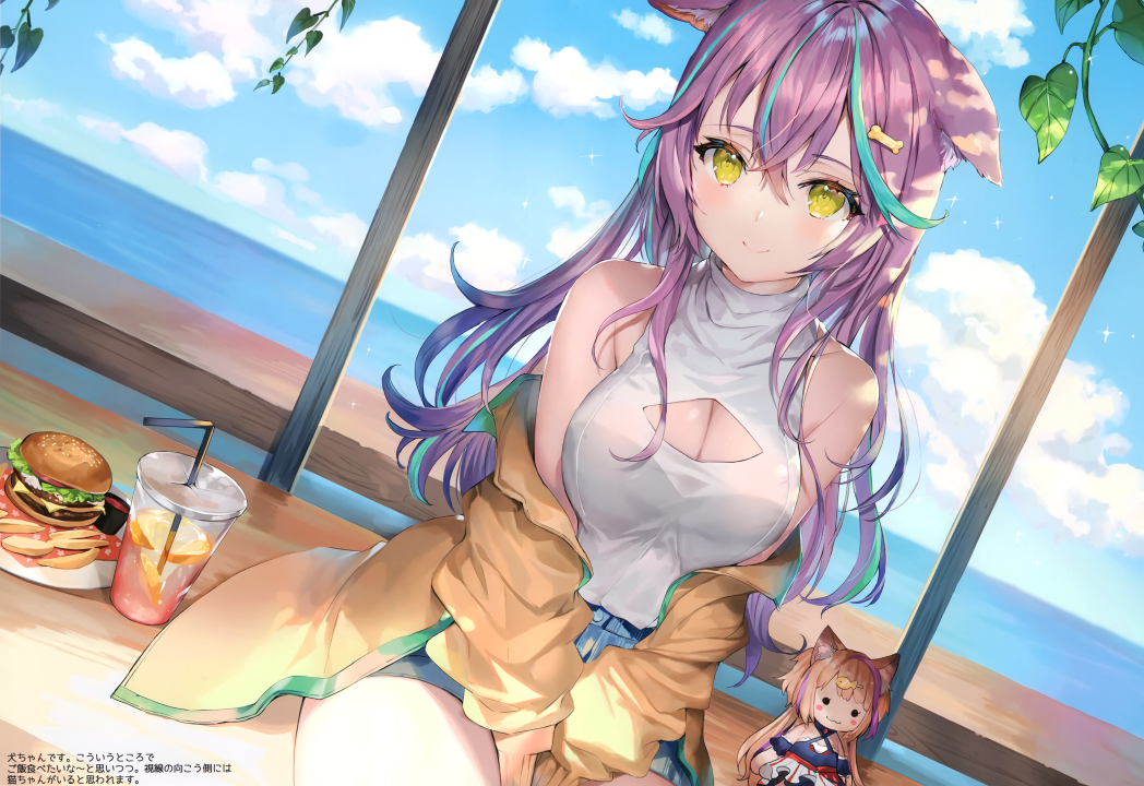 莫莫科、紫色头发、微笑、动漫、动漫女孩、AI艺术、黄眼睛、兽耳