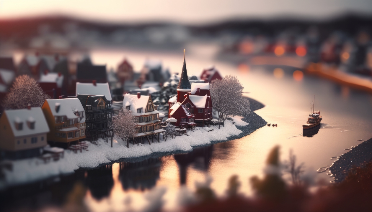 艺术、倾斜、城镇、河流、雪、水、倒影、船、AI艺术