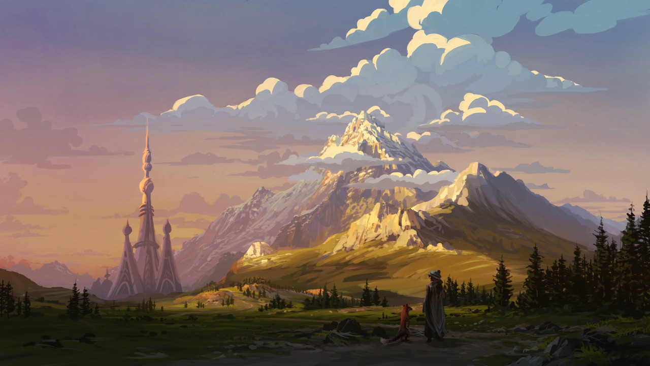 风景、塔、山、云、雾、森林、帽子、斗篷