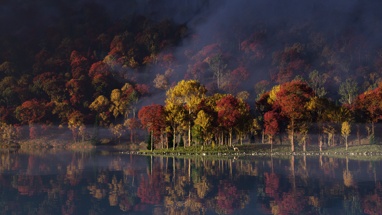 湖泊、树木、自然、风景、薄雾、反射、水