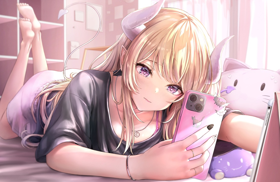 女性、赤脚、金发、长发、动漫、女孩、室内、兽耳、角、智能手机、紫色眼睛、黑色指甲、项链、手机
