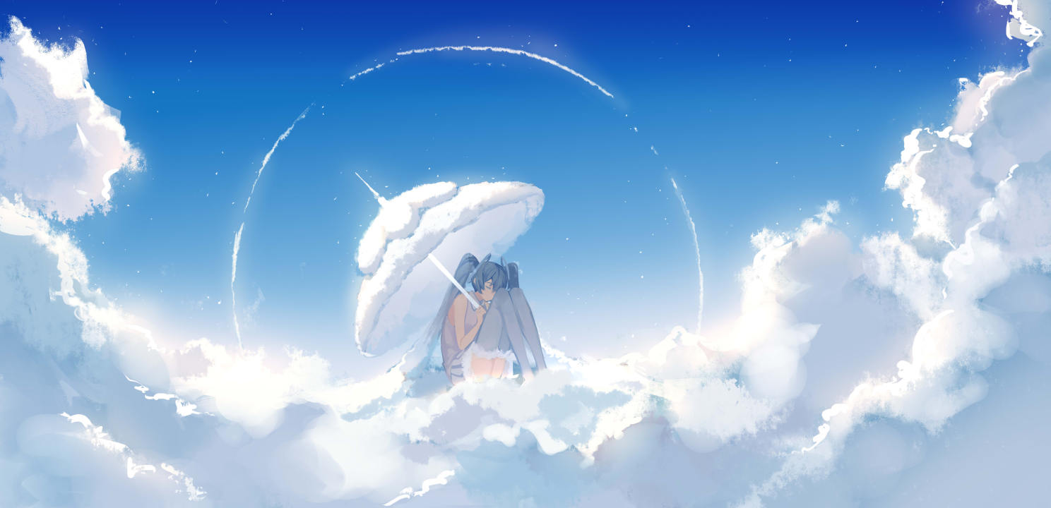 闭眼、动漫、女孩、初音、小提琴、天空、云、伞、双尾