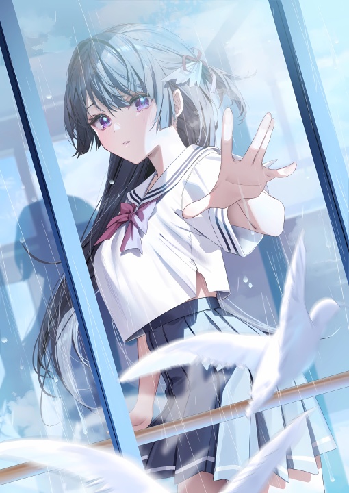 女学生、长发、站立、动漫、女孩、校服、小鸟、阳光、倒影