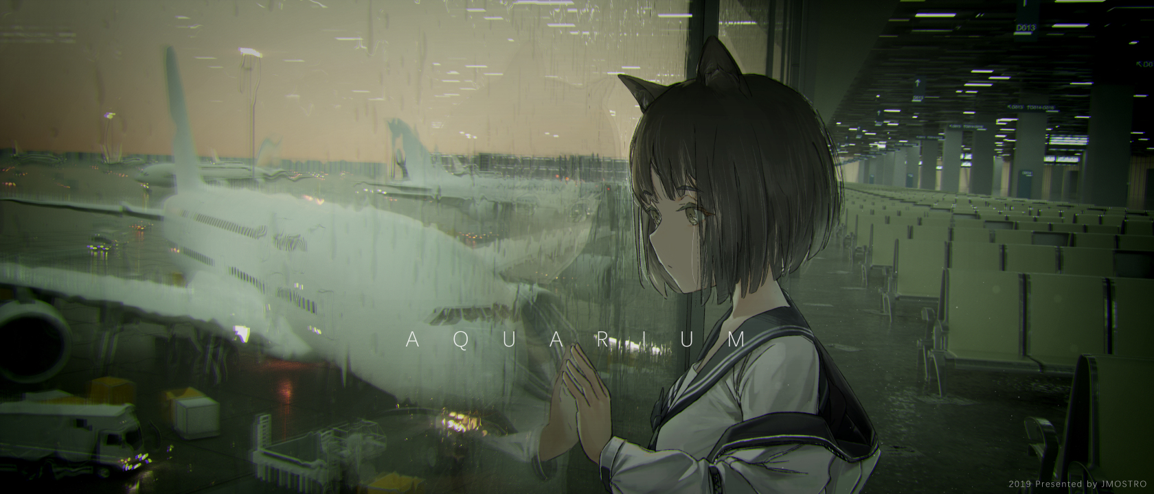 动漫、女孩、雨、猫耳朵、机场、玻璃、眺望