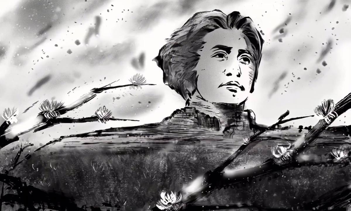 “黑白色调,枝头绽放的樱花与坚定的眼神”