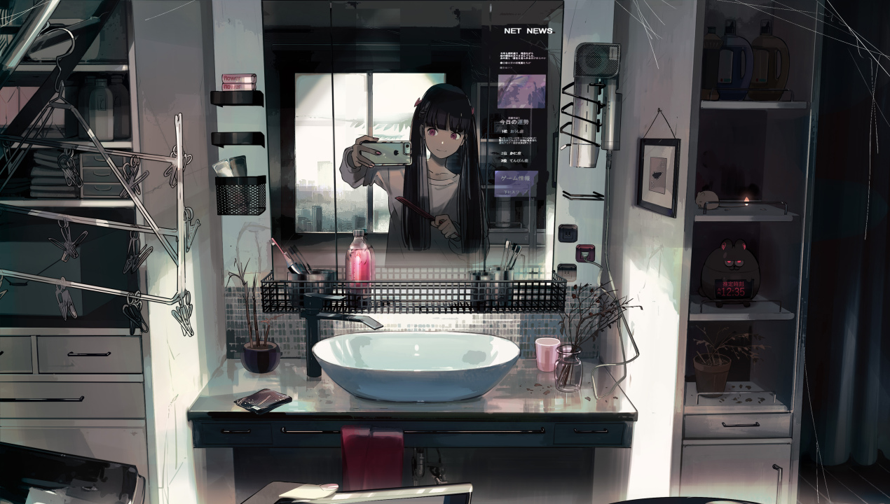 原创、人物、库卡、红眼、动漫、女孩、浴室、倒影、镜子、影子、自拍、黑发