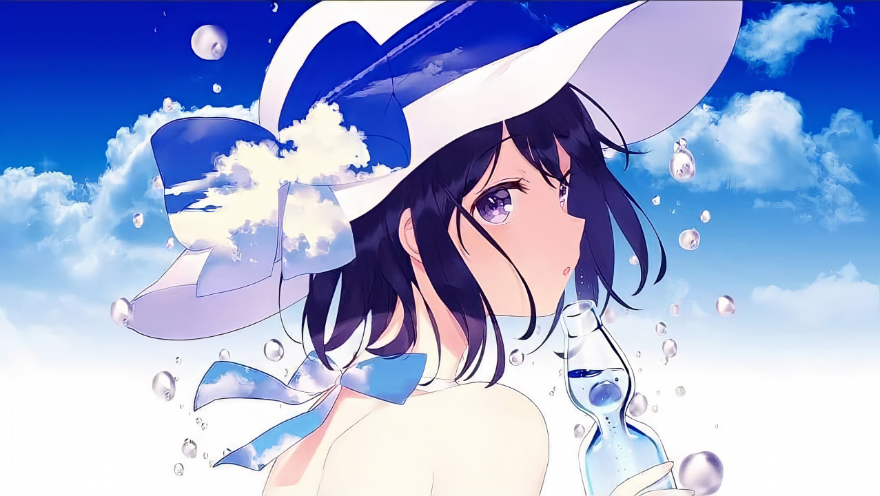 蓝色、头发、肩膀、短发、动漫女孩、云彩、太阳帽