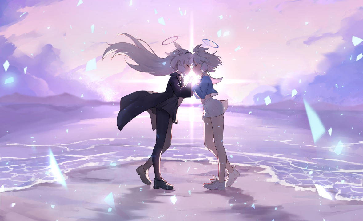 短发、长发、动漫、动漫女孩、蔚蓝档案、阿罗纳、海洋、光环、海滩、水、云、阳光