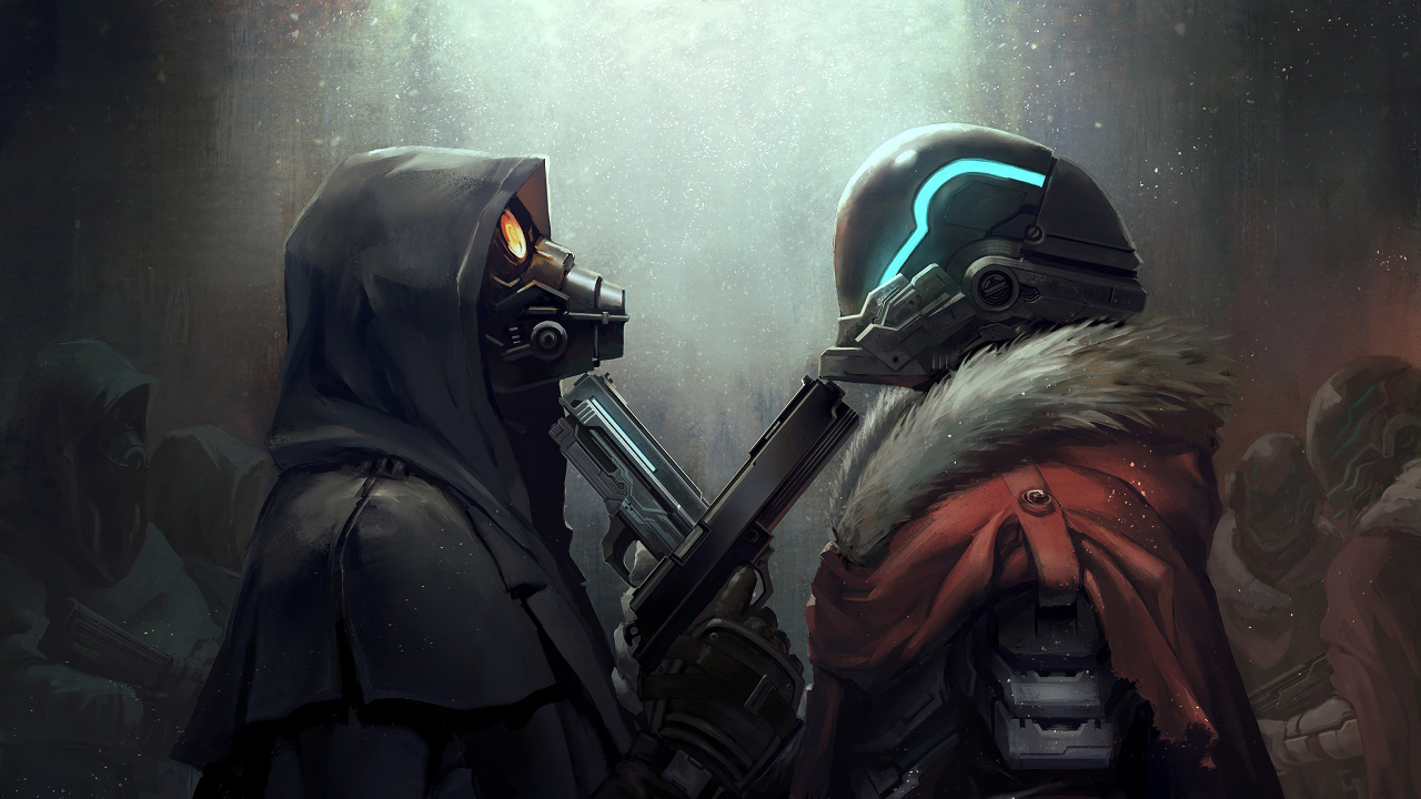 数字艺术、艺术品、绘画、数字绘画、未来主义、枪支、科幻、面具、兜帽、手枪、武器、头盔、网络、视频游戏艺术、电子游戏跨界、命运(电子游戏)、迷失星球