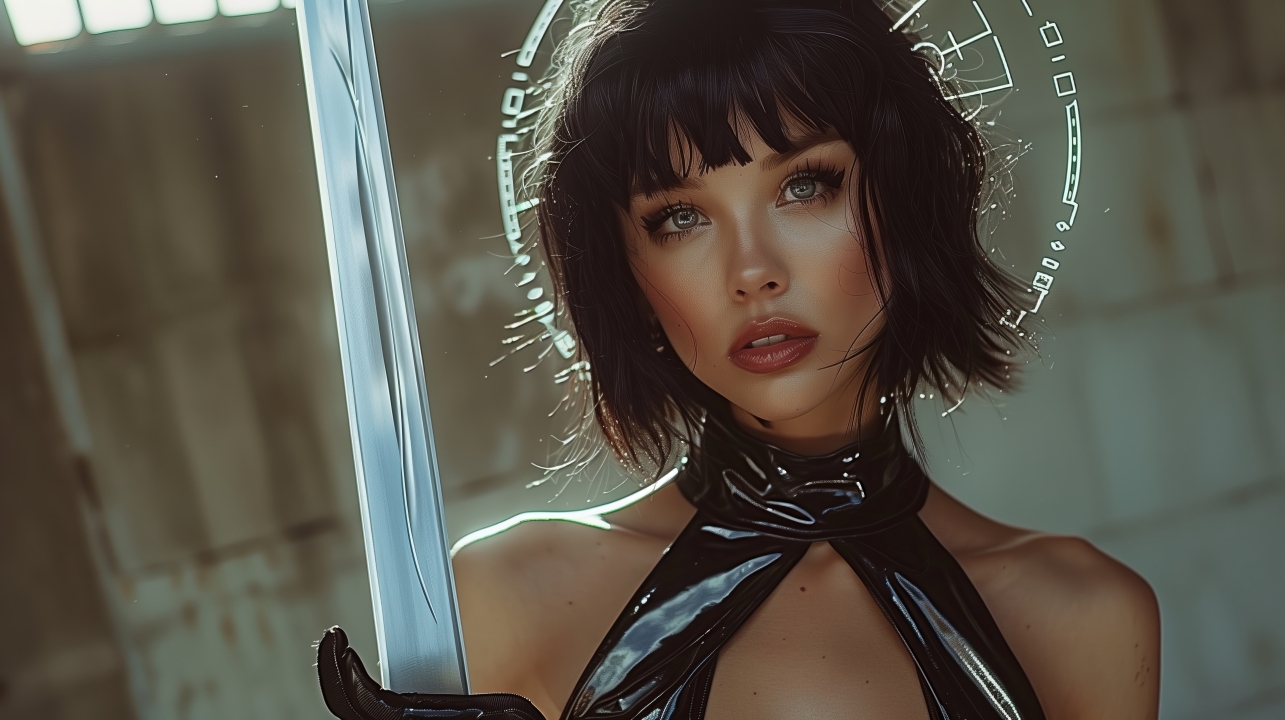 女性、看着观众、剑、光环