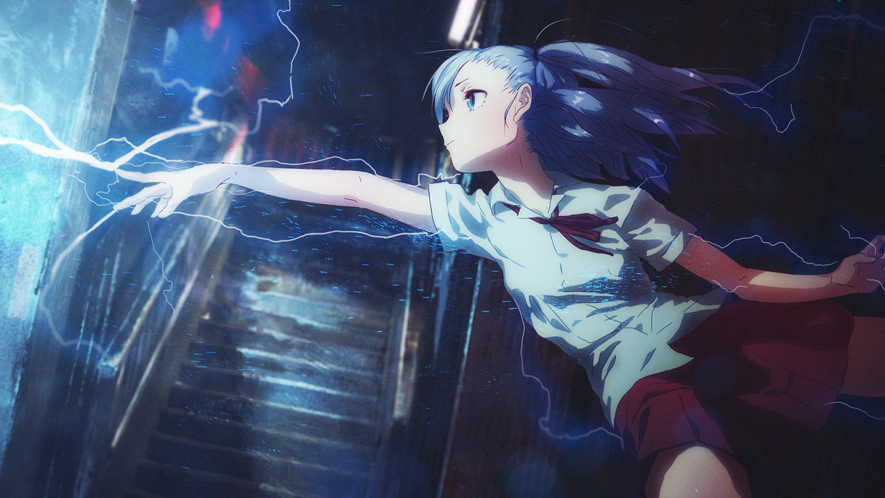 原创、人物、蓝头发、蓝眼睛、动漫、女孩、闪电、校服